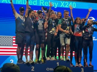 Our team — Tracy Kellner, Bill Bender, Christel Kippenhan, and me — came in 2nd out of 22 teams, earning the silver medal and missing gold by just 34 seconds. A small wetsuit issue by one of my teammates in T1 cost us the gold, but that’s triathlon! Still, standing on the podium representing Team USA was an unforgettable thrill.